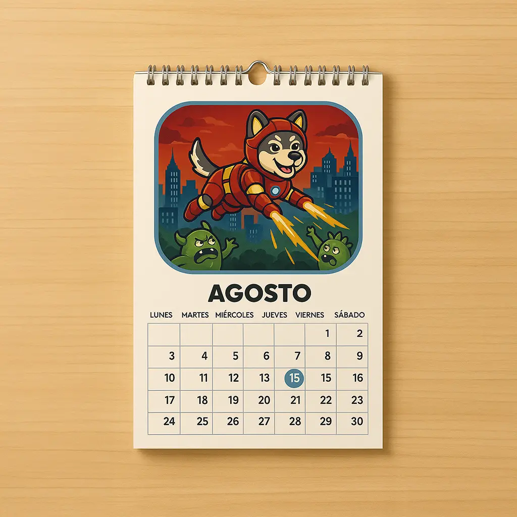 Un calendario donde cada mes es una versión distinta de tu lomito, combinada con lo que más te gusta. Diseño personalizado para celebrar el año contigo. 🐾🗓️